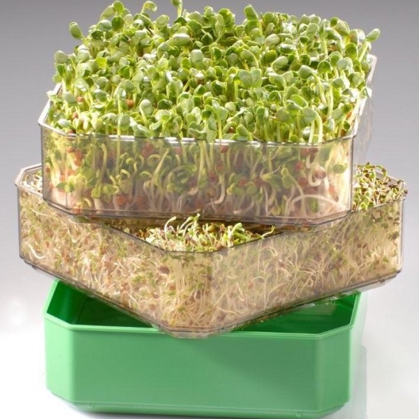 Les graines sont placées dans un germoir. Il ne faut pas en mettre de trop, pour qu’elles soient encore bien aérées lorsqu’elles germeront. Un germoir est constitué d’une sorte de passoire, sous laquelle se trouve un récipient récupérateur d’eau.